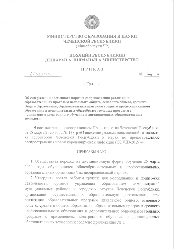 25.03.2020В целях противодействия распространению инфекции коронавируса Министерство образования и науки Чеченской Республики информирует о переходе 25 марта 2020 года обучающихся общеобразовательных и профессиональных образовательных организаций на дистанционную форму обучения!